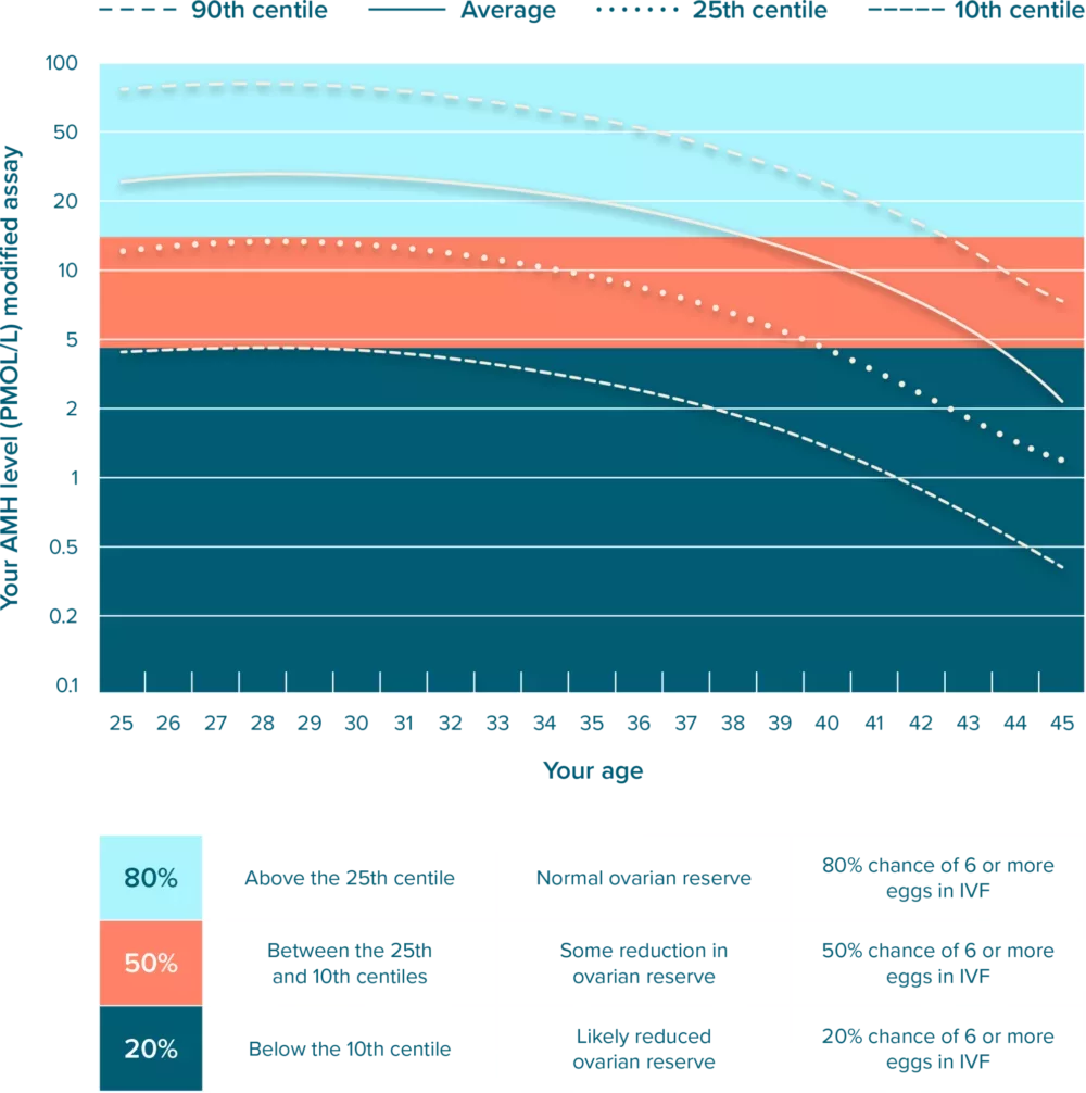 Like most fertility tests, an AMH test does not give a 'black and white' answer. We plot the AMH result on a graph, (see below), that shows the 10th, 50th and 90th centiles for AMH for women attending a fertility clinic. This lets you compare your results with women of a similar age and helps predict how your AMH level may change over the years. We have shaded areas of the graph green, orange and red to represent the average impact of your AMH level.